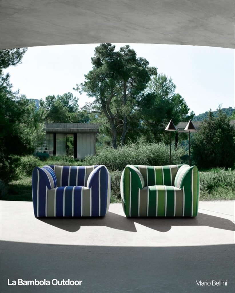Outra releitura de Bellini, a poltrona La Bambola pega emprestada a base da icônica coleção Le Bambole, projetada em 1972 e premiada com o Compasso d’Oro em 1979. Agora para o ar livre, a La Bambola é feita com materiais reciclados e recicláveis, resistentes às intempéries e de alto desempenho.