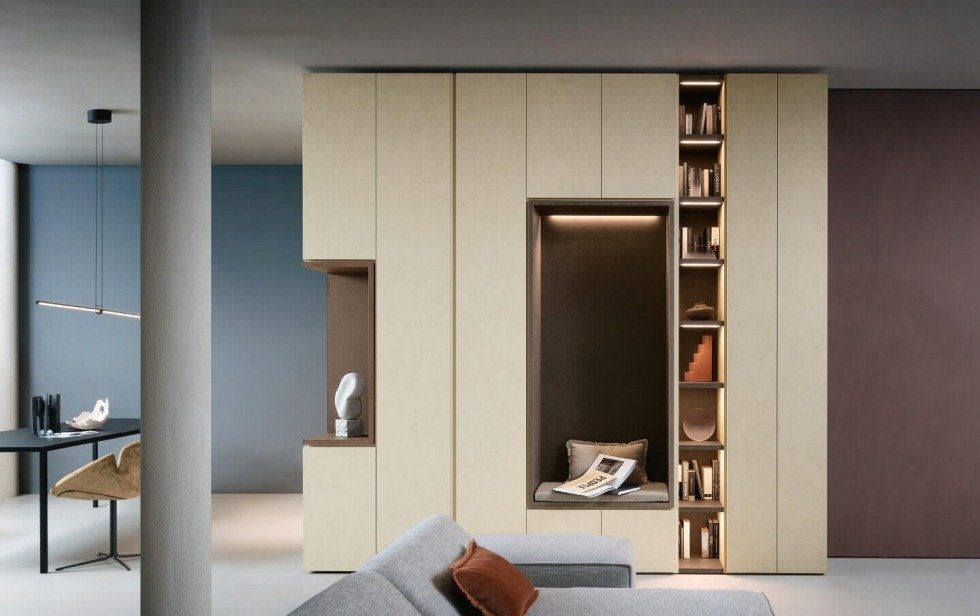 Na prática, vemos diferentes tipos de móveis e uma ampla gama de frentes: desde portas com armações de alumínio, de correr ou de abrir com frentes sólidas e acabamento texturizado, até painéis lisos com puxadores de altura total, integrados ou salientes.